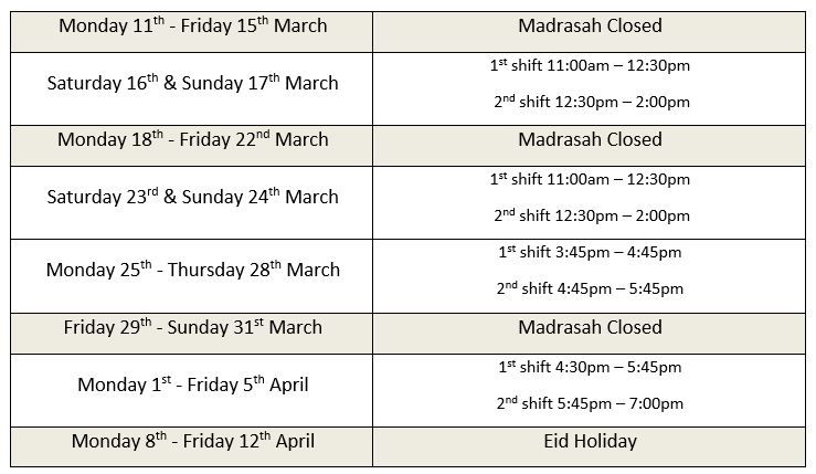 The Taleemi Board understand this may cause some disruption. If you have any questions, please email: madrasah@masjidalfarouq.org.uk